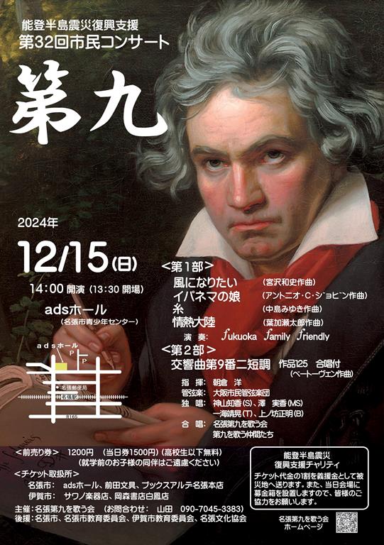 令和6年は元日に能登半島に大地震が発生し、しかも9月には同じ地域に今度は豪雨が襲うという大変痛ましい出来事がありました。人々がつながり合い心を寄せ合って兄弟となると第九を歌っている我々として、何かお役に立てないかと考え、今回の演奏会は能登半島地震・水害災害からの復興支援を兼ねた演奏会とさせていただきました。
