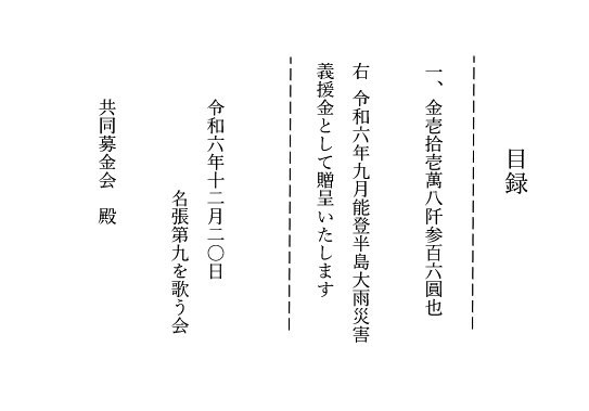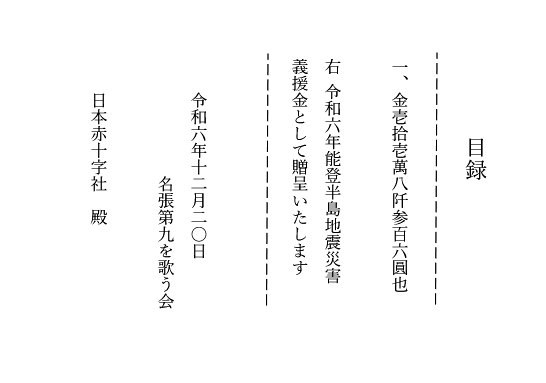 今回の演奏会は、令和6年に能登半島に甚大な被害を与えた1月の地震と9月の大雨という2つの災害からの復興支援を目的の一つとして行われました。チケット売上金の1割(75,900円)と当日会場で集めた募金(160,712円)を合わせて236,612円を義援金として12月20日に名張市社会福祉協議会へお届けしました。