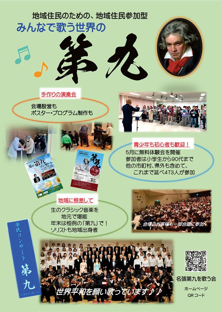 平成3年に名張でも第九を歌いたいという熱い思いを持った仲間の発起によりスタートしました。以来毎年12月にadsホール(名張市青少年センター)で市民コンサート「第九」を開催しています。ただ、令和2年と3年はコロナウイルス感染症拡大防止のためやむなく演奏会を中止しました。